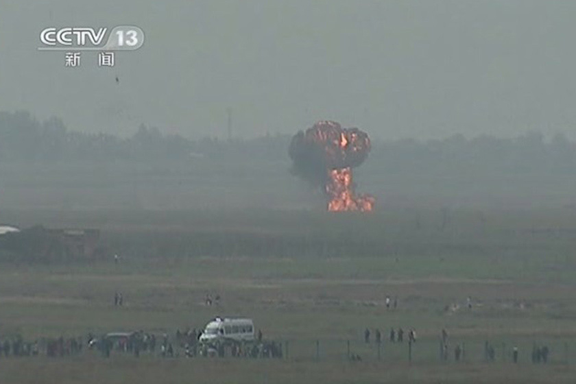 (视频截图)2011年10月14日上午,2011中国国际通用航空大会在陕西蒲城举行飞行表演时,一架战机出现意外坠机。