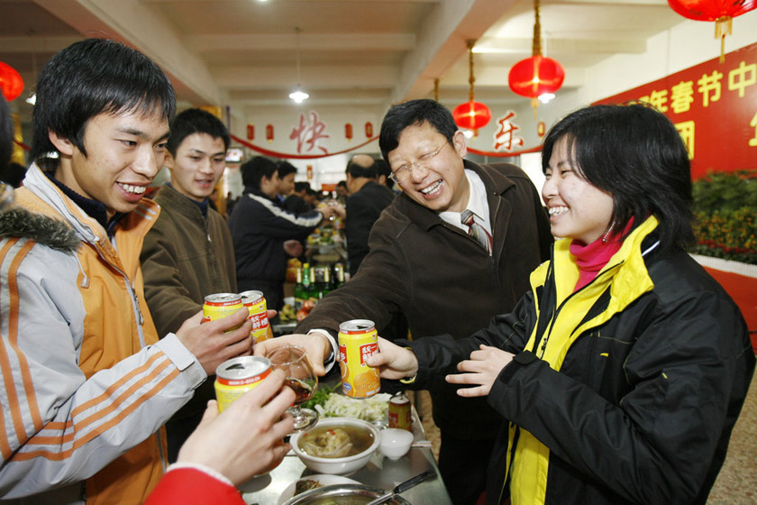 每年在大学里都有一些学生由于种种原因没有回家,还好有同学和老师在一起陪伴吃年夜饭。图为2007年2月17日(除夕),中南大学为千余名留校大学生举办团年宴。 刘尚文/CFP