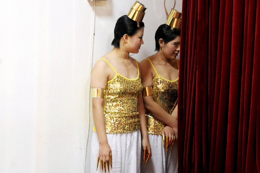 1月19日,天津市女子监狱的两名服刑人员在后台准备演出。 新华社发 王鲲/摄