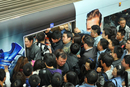 4月10日,下车的市民奋力向外挤,部分被上车的市民挤回车中。 东方IC