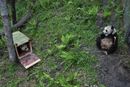 5月3日,四川卧龙野化培训基地,假扮熊猫的工作人员将母仔俩抬到三期野化培训圈。 衡毅/CFP