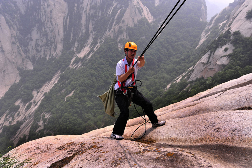 5月10日,陕西华山东峰悬崖边,几名环卫工人正在放绳下崖。 陈团结/CFP