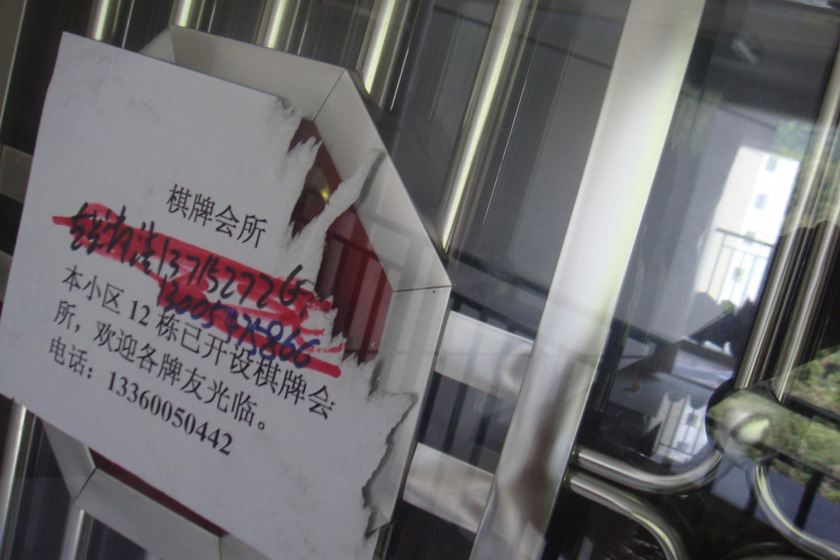 7月10日,深圳,12A栋22C棋牌会所广告,在侨香村14栋电梯内也有。小区其他业主称,近一个月来就看到该广告;管理处则无奈表示,他们多次用石灰粉涂掉广告,但“写了就涂,涂了又写”。 CFP