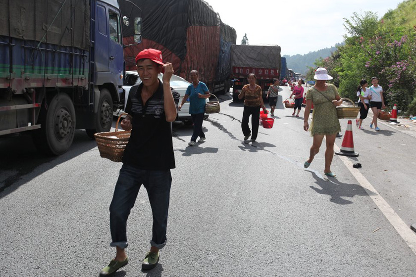 8月23日,湖南新晃,车辆被堵村民不顾危险上路卖物品。 李俊锋/CFP