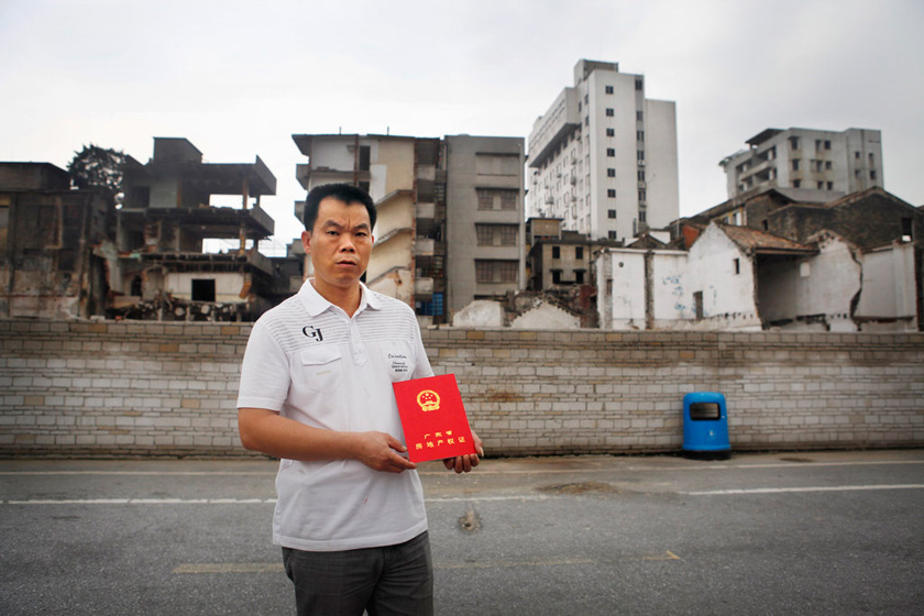 9月5日,佛山市禅城区升平路,邓时潮拿着房产证站在被拆掉的铺面前留影,这商铺是他花140多万拍卖所得,如今却成一片废墟。 张明术/CFP