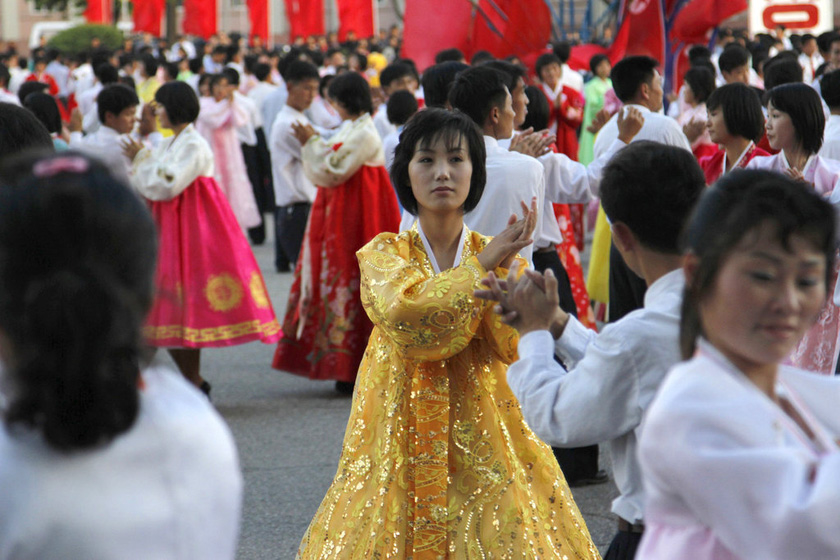 10月10日,民众在平壤体育馆外翩翩起舞庆祝朝鲜劳动党成立67周年。 Jon Chol Jin/东方IC