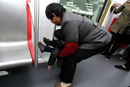 11月20日,一名乘客踩踏地铁的扶手。 浙报集团/东方IC