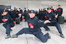 12月19日,严康力(左)、朱洪震(中)、何明俊(右)在郑州火车站集结点摆出武打造型。 马昕/CFP