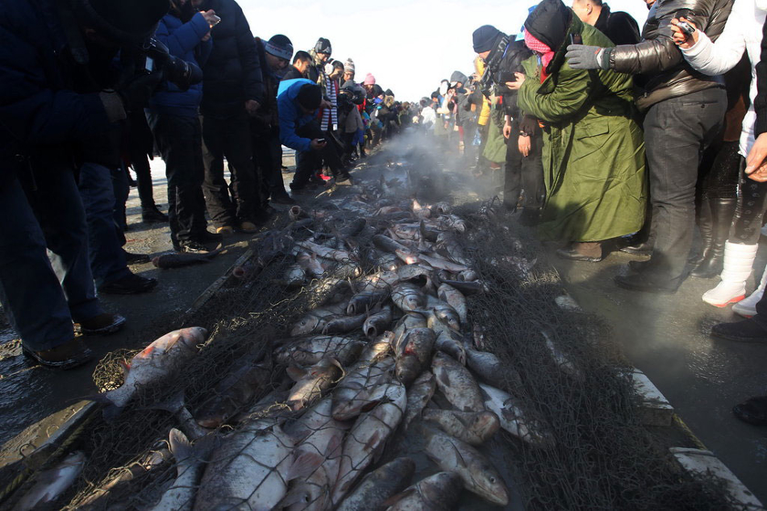 干湖内盛产鲤鱼、鲢鱼、鳙鱼(胖头鱼)、鲫鱼,有鱼类30多种。其中胖头鱼最有名。图为冬捕现场。 Cherry Hu/CFP