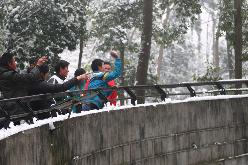 杭州游客用雪球扔狮子 狮子惊吓躲闪