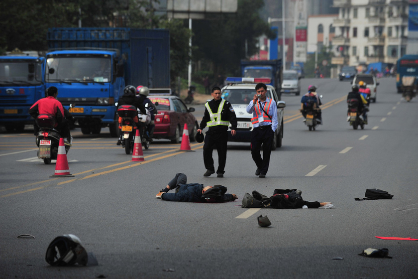 遇难者的头盔散落在地上。 中山日报赵学民/东方IC