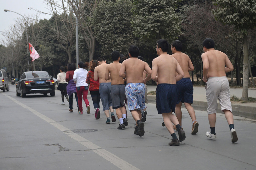 2月18日,成都,受罚员工在三环路上赤膊跑步。 成都商报/CFP