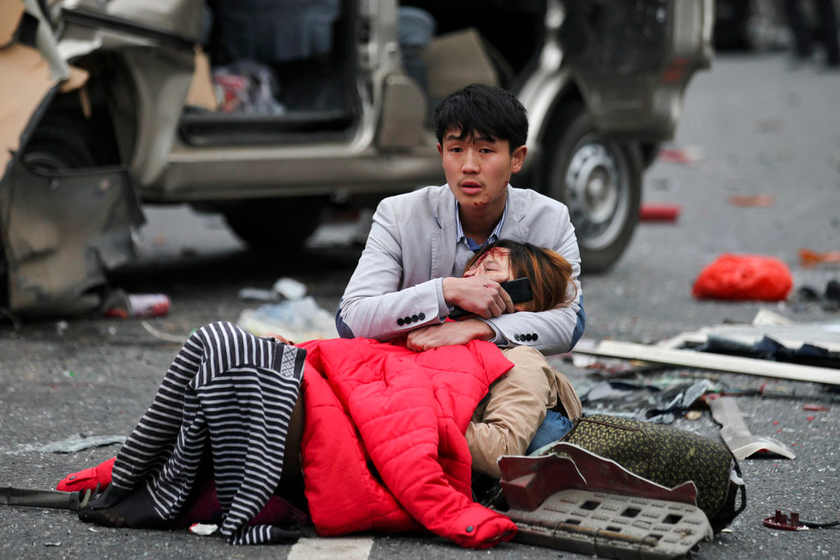 2月25日,从四川巴中去江苏常州打工的冉元俊抱着受伤的妻子张晓悦,和其他伤者一起坐在车祸现场等待救援。 华商报黄利健/CFP