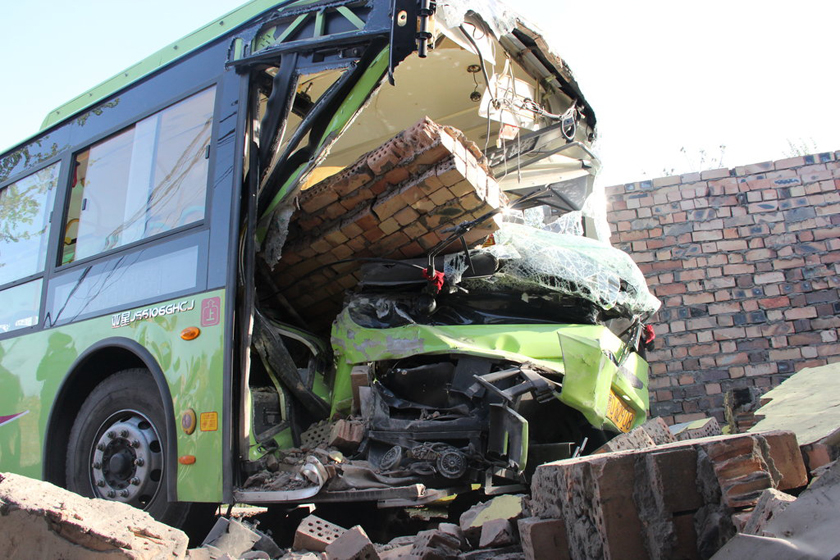 - 4月9日,河南平顶山市,一辆载有四十多名乘客的公交车直接撞塌长约六、七米的围墙,导致车中四十多名乘客受伤。其中一怀孕4个月左右孕妇昏迷,一对夫妻伤势严重,现在医院急诊室抢救中。 蔡长伟/CFP