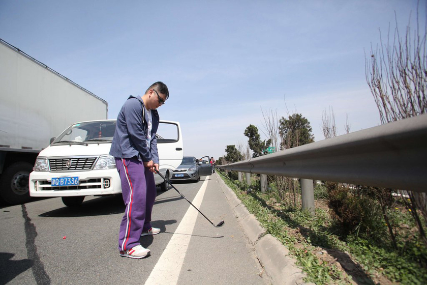 4月29日,五一假期第一天,7座及以下小型客车免费通行,车辆集中出行导致车流量比平时增长20%至50%,荣乌高速河北省海兴至山东滨州段高速堵车五小时。图为荣乌高速公路山东滨州段,无聊的乘客开始拿出高尔夫球在路边练习。 指月/CFP