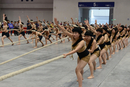 5月16日,重庆国博中心,数十名青年男女手握纤绳表演船工拉纤生活。 人长江/CFP