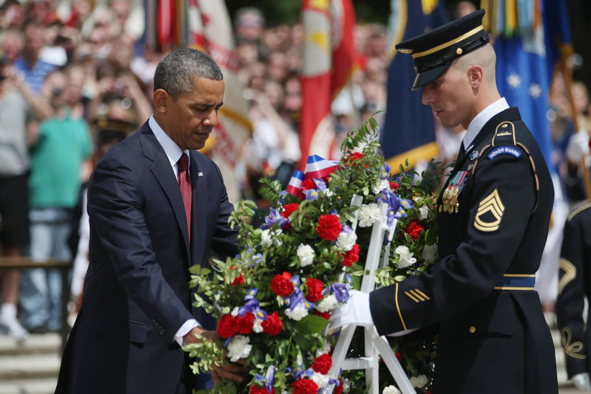 - 当地时间5月27日,美国阿灵顿国家公墓举行“阵亡将士纪念日”活动,美国总统奥巴马与妻子米歇尔出席。每年5月的最后一个星期一为美国阵亡将士纪念日,悼念在各战争中阵亡的美军将士。图为奥巴马向无名烈士墓敬献花圈。 Mark Wilson/CFP