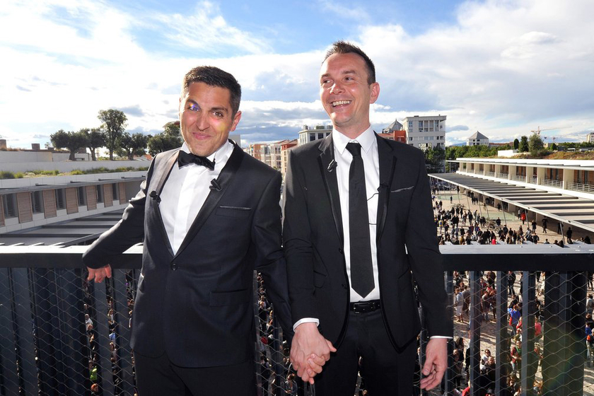 当地时间5月29日,法国南部蒙彼利埃,法国两名男同性恋者樊尚·奥丹(右)和布吕诺·布瓦罗举行婚礼,成为法国同性婚姻法生效后首对合法结婚的同性伴侣。4月23日,法国国民议会以331票赞成、225票反对的投票结果,最终通过同性恋婚姻及收养子女法案。该法不仅为同性恋者结婚开了绿灯,也允许同性恋家庭领养子女。 CFP