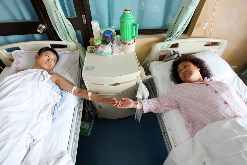 6月27日,山东省潍坊市人民医院病房,即将走进手术室为儿子捐肾的王传丽深情地看着孩子,不时地擦拭眼角的泪水。 张驰/CFP