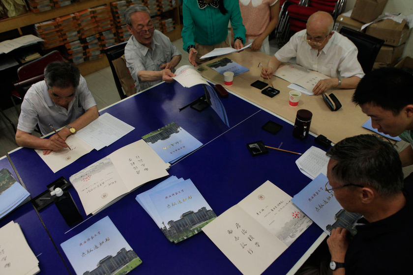 7月15日,陕西师范大学,老师们用毛笔写着新生录取通知书。这些老师都是陕西师范大学的离退休老教授和教师,他们中年龄最大的两位老先生已经80岁,最小的也已59岁。今年,他们一共要写4570份通知书。 华商报董国梁/CFP