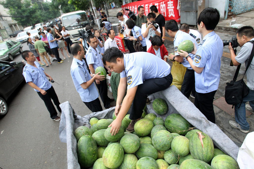 - 7月23日,郑州,城管把这些西瓜免费送给环卫工。 小小/CFP