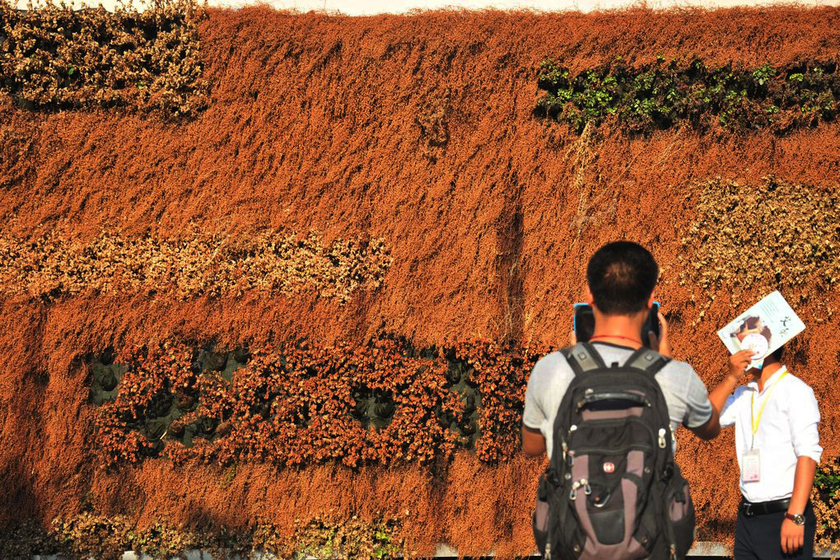 7月23日,中伏第一天,杭州气温到达39.6℃。24日下午,气温继续攀升,达40℃,这是杭州自1951年以来第3次触碰到40℃。杭州延安路上凤起路地铁口一堵绿色植物装饰墙,由于缺水,绿色植物遭高温暴晒枯萎死亡。 朱引炜/CFP