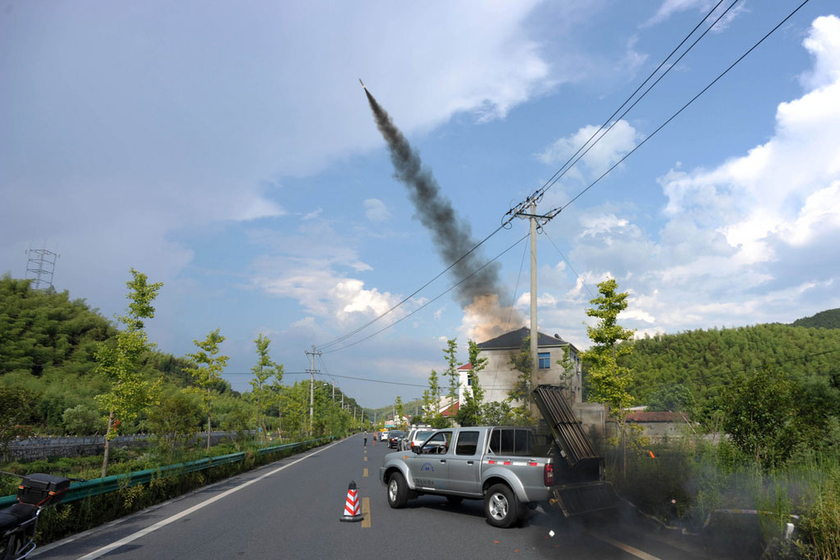 7月30日,为缓解持续高温天气造成的旱情,浙江杭州和上虞发射增雨火箭弹进行人工增雨。图为杭州市气象台在余杭区鸬鸟镇实施人工增雨作业。 东方IC