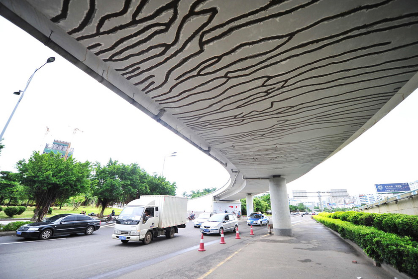 - 8月7日,海口市南大桥国兴大道引桥桥体出现密密麻麻的裂缝。 CFP