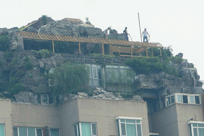 - 北京白石桥路45号的人济山庄小区B栋楼顶平台上建造了一片两层的小楼,墙体外表还用岩石质感外壳包裹上,并在外壳上种上一些花草。图为拆除前的楼顶别墅。 小山/CFP