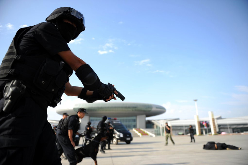 8月16日,乌鲁木齐市特警八支队在即将召开的第三届中国-亚欧博览会举办地,新疆国际会展中心举行反恐处突实战演练。据介绍,该特警支队还将在第三届中国-亚欧博览会召开前举行多次实地防恐演练,确保第三届中国-亚欧博览会顺利举办。 马元/CFP