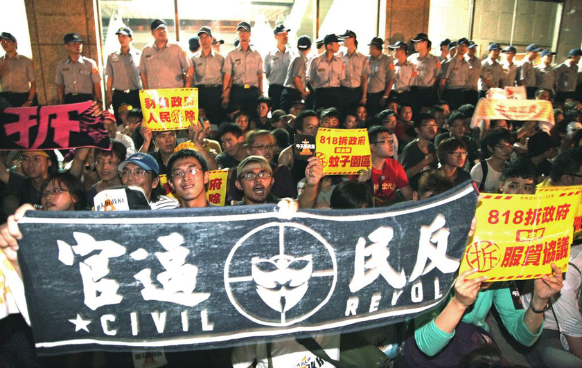 8月18日晚,台北上万民众集会,抗议苗栗县政府强拆民宅以发展科学园区。苗栗县政府为配合一个科学园项目,7月18日强行拆除四户不肯迁离的民宅。有上千人突袭占领“内政部”的大楼,赶至增援的警察也被逐走。 CFP