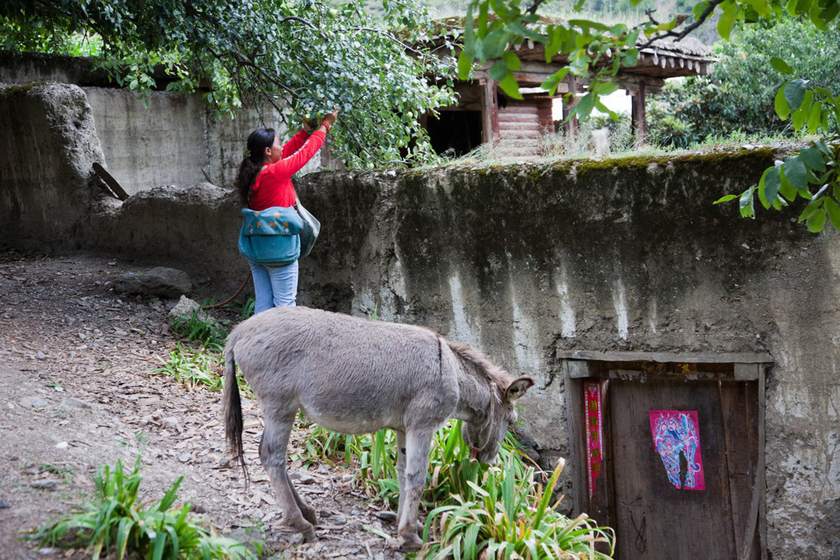 这次要去的红坡村,海拔4000多米。是从云岭乡政府的背后出发,先爬上一个将近90度的大山坡,再徒步三小时才能到达。路面极其狭窄,只有零星带刺石竹目植物,泥土风化严重,雨天里常有泥石流的危险。在没有通车的日子,平时投递2个村庄后,再沿着羊肠小道直插只有1900米海拔的澜沧江河谷,顺着河谷走13公里,过溜索到对岸的3个村子,来回行走五十多公里,要两天时间。前方总是山路阻隔,山峦叠嶂,看起来近在咫尺,走起路来却遥遥无期,“从这边看对面的村子,就是一瞬间,但绕来绕去,要走一天。”直至村里人炸了山,通了路。拉木的丈夫有一辆面包车,在不拉货和拉客的日子,丈夫心疼她,就充当了免费司机,送她送邮,一天就可来回。不少村里还修起了桥,溜索越来越成为拉木的回忆。山与山之间,有山涧不断,她不停遇到它们。她快速地穿过两根木头搭建的“木桥”。雨季,流量大的时候,整座“桥”其实是泡在水中的。桥下,涧流湍急,但转念想一想,跨过去,不远处,就有甘甜的泉水喝。于是,她又笑了。多数时候,大山连绵不断,荒无人烟。休息时,她给丈夫打了个电话,询问病重的父亲在香格里拉医院的情况。“都是哥哥嫂嫂在照顾他,这么多年,我总是没法走开。”电话挂断,她的脸上颇多踌躇。一个人送邮,那么多年,她也感觉单调与枯燥。大山沉默,她也沉默。“秋冬交际,山变秃了,没了颜色,心里也会莫名地难过……不见了孔雀一般的山鸡,横冲直撞的山猫与麻雀。”她不能理解春夏秋冬的时令节奏,只因这变化让她孤单。她喜欢五彩缤纷,就像手上戴着藏族人嫁娶时欢乐的黄金紫宝石戒指,脖子上挂着纯白珍珠项链。偶尔,她会唱歌给自己解闷,“青藏高原。还有流行歌曲。听着听着就学会了,从不知道叫什么。”她唱给我听,又觉得唱得不好,有些羞赧。