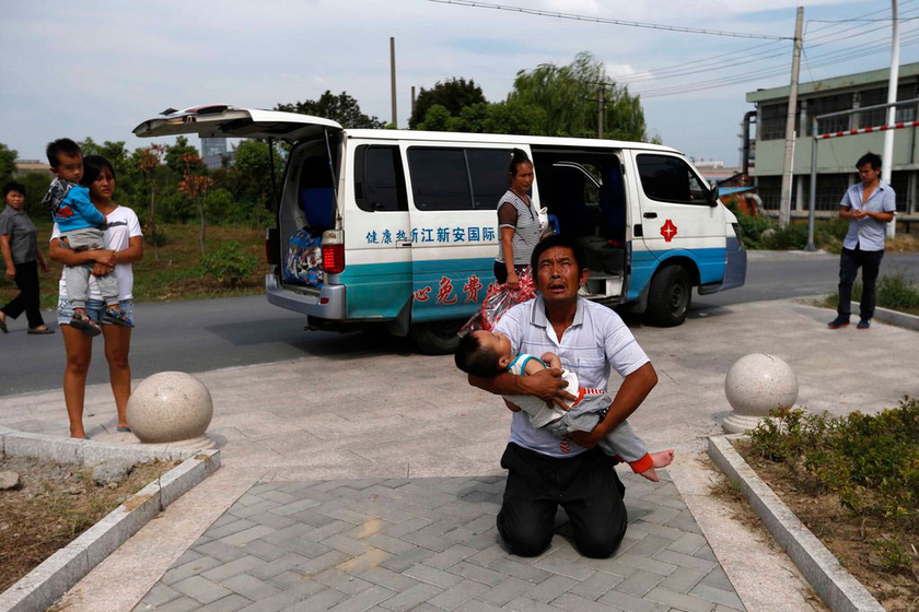 陈文才今年50多岁,来自贵州毕节,在浙江海宁打工。5月7日,刚满一岁的孙儿陈显阳被樱桃核卡住气管,转送去杭州救治。樱桃核被成功取出,因堵塞时间太长,孩子缺氧,在重症监护室治疗一个月。家里钱花光了,为了救儿子,6月11日,陈显阳的父亲拿着菜刀和扳手去抢银行。7月份,因无钱医治,陈显阳的爷爷只得将他接回海宁的租住房内。8月28日,陈显阳的父亲被酌情轻判有期徒刑三年半,母亲离家出走。照顾陈显阳的重担就压在爷爷奶奶身上。为了还上孙儿看病借来的钱,陈文才老人到工地上做钢筋工,每天工作9小时,赚180元。图为9月3日,浙江海宁,陈文才上救护车前,突然跪谢苍天,请求老天再给他孙儿一次活命机会。 储永志 /CFP