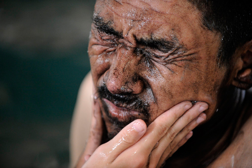 2011年6月16日,山西介休,一名矿工父亲享受着孩子为他洗脸。 胡远嘉/CFP