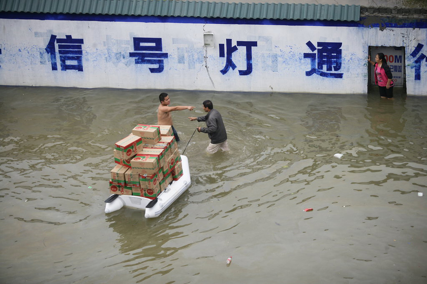 10月9日,浙江余姚凤山街道,志愿者还没来得及发放救援物资时,群众中有人说了一声“他们只发给本地人,不发给外地人”,一名外地男子与志愿者发生肢体冲突,并推翻装满物资的小船,20余箱米饼遭哄抢。在民兵的保护下,志愿者又送来50余箱米饼,发放给灾区群众。 CFP