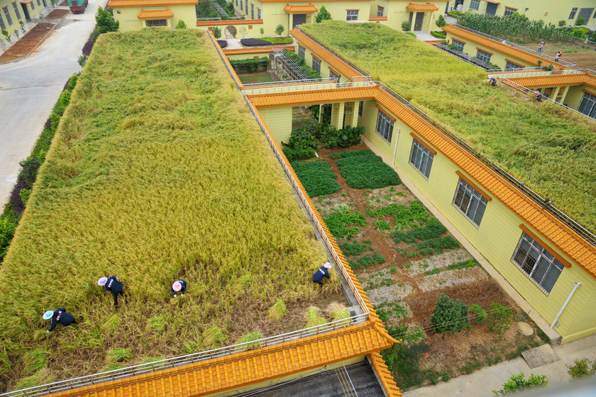 10月16日,广西柳州市柳江县穿山食品工业园的一家酒类生产企业,生产车间楼顶上种植的第二季水稻开始收割。 CFP
