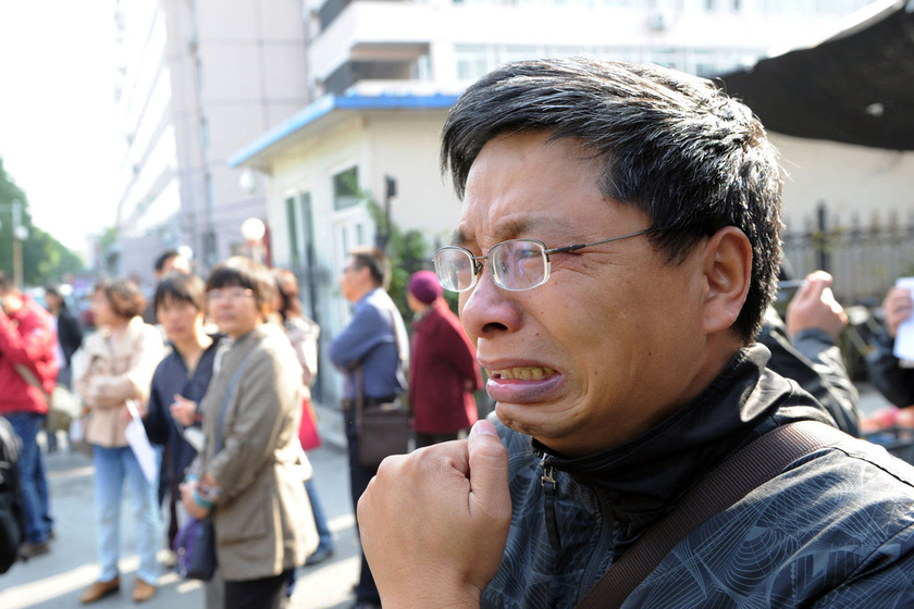 2012年10月25日,北京教委门前,四川的一名家长伤心落泪。当日,异地高考考生家长聚集于此,希望教育部门能够尽快出台异地高考的相关政策,并及时对外公布信息。 项春雷/CFP