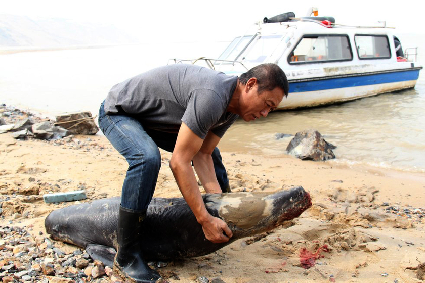 10月24日,江西永修,渔政工作人员将死亡江豚带离现场。 游雄 魏东升/CFP