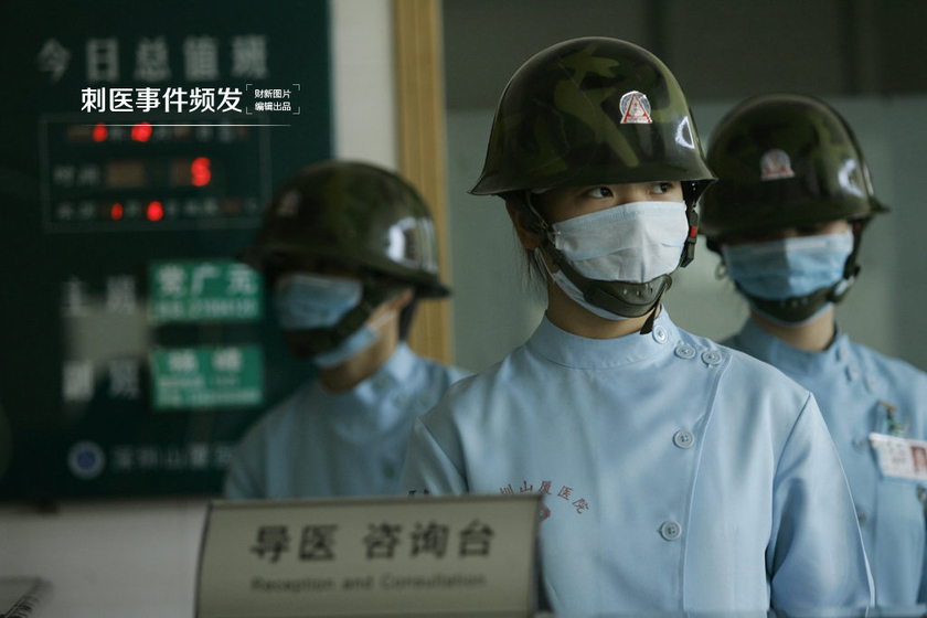 10月25日,浙江省温岭市第一人民医院的三名医生在门诊为病人看病时被一名男子捅伤,其中耳鼻咽喉科主任医师王云杰因抢救无效死亡。近年来,医患关系颇为紧张,患方敲诈、辱骂、殴打医务人员,围攻医院,有甚者故意将医务人员致残、致死……一幕幕暴力恶性事件在全国频频“上演”。图为广东省深圳市龙岗区平湖街道的山厦医院医生护士全部佩戴钢盔上班。 陈以怀/CFP(编辑:鲁勇 实习生 冷含章)