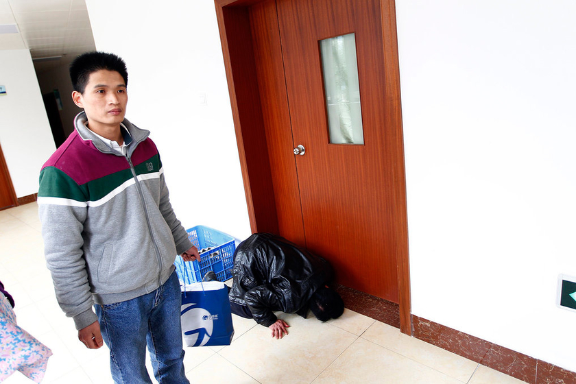2012年2月28日,广东珠海,家属来到院长办公室,因怀疑院长把自己反锁在办公室里,家属试图透过门缝查看室内情况。前日,刘先生的爱人入住香洲区第二人民医院临产,待产时检查一切正常,而孩子被抱出产房时却被宣告已经死亡。拒绝尸检的家属认为,院方存在责任,提出百万元的巨额赔偿,并爬上楼顶声称要跳楼。院方表示,希望通过合法途径进行解决。 梁清/CFP