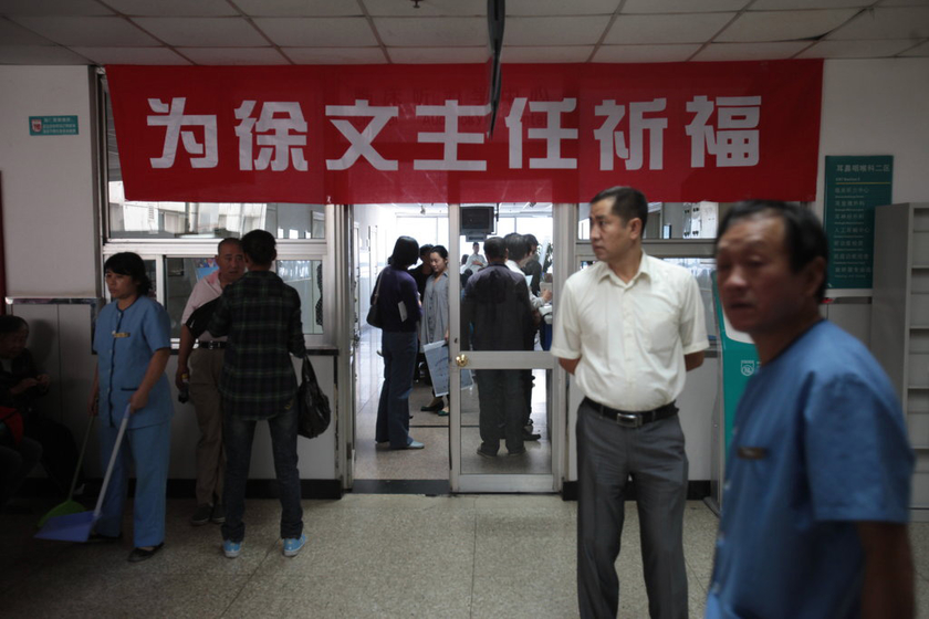 2011年9月19日,北京同仁医院,耳鼻咽喉头颈外科悬挂的条幅。当天,同仁医院为受伤医生祈福。9月15日,北京同仁医院耳鼻咽喉头颈外科主任医师徐文,被一名男子持刀追砍,身中21刀,经抢救脱离生命危险。当天,嫌疑人被警方控制,家属证实,其为书法家王宝洺。王宝洺的家属称,5年前其患喉癌后,在同仁医院接受过一次“破坏性手术”,导致其不得不切除全喉,从此失声致残。 CFP