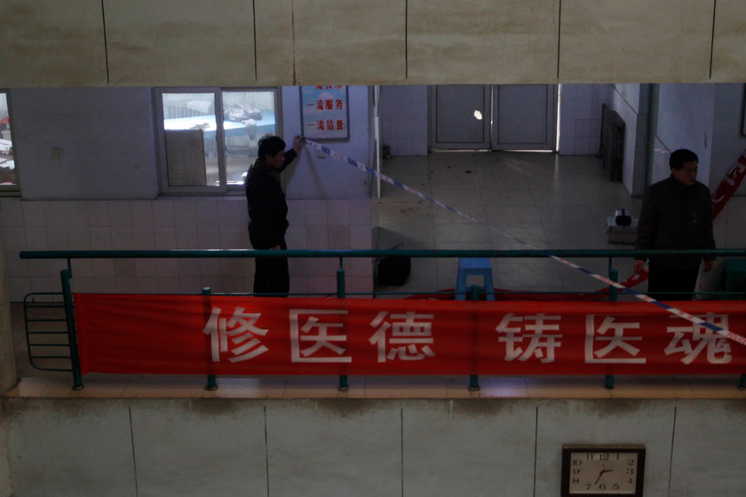 2012年12月14日11时许,河北省邢台市,一名男子持刀进入河北柏乡县人民医院,将三名医生和一位患者砍伤,耳鼻喉科主任常孟枝死亡。事发医院的2楼,正在布置警戒线。 CFP