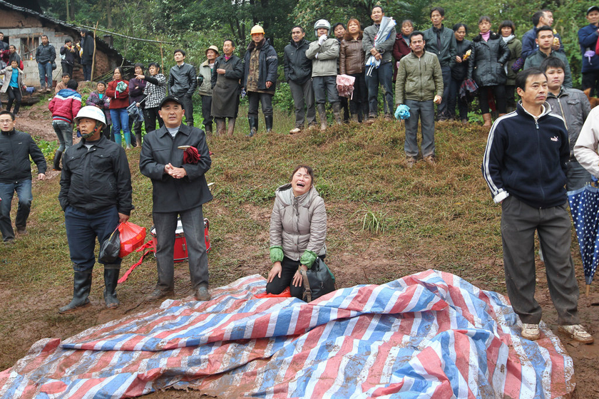 11月12日,湖南桃源县,遇难者家属守在尸体旁。 希达/CFP