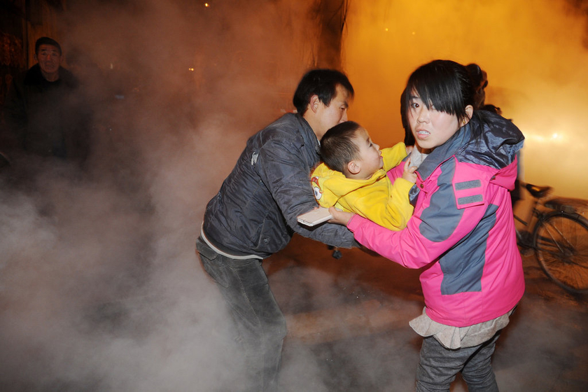 11月25日,太原和平南路十六中附近马路中间的热力管道破裂,热水散出的雾把整个马路罩住。因热力管道流出的水温度较高,造成了路面雾气弥漫,有路人被烫伤。图为为了防止孩子烫伤,家长接力抱孩子过马路。 2飞/CFP