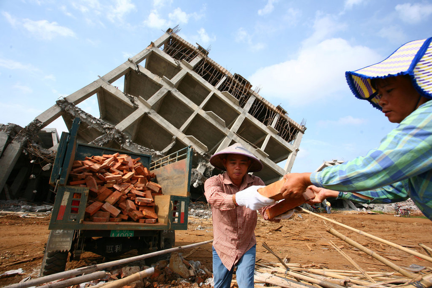 2010年8月6日,海南省海口市,一些拆迁后的违建“小产权房”倒成一片,工人在小产权房废墟里清理。5日,海南省海口市政府组织规划、国土等多部门联合将位于丁村城南路东侧的13栋近2万平米违法建筑实施定向爆破拆除。 南海/CFP
