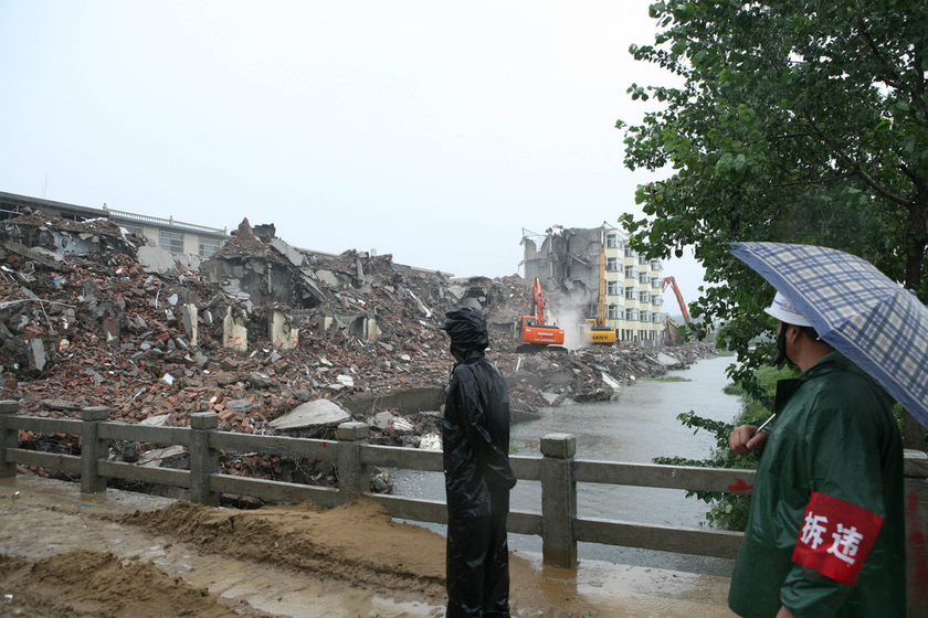 2009年8月29日,安徽蒙城县组织城建、国土、公安、房产等单位,动用大型机械,依法对位于该县庄周办事处二里吴社区一处1.1万平方米的非法“小产权房”实施强制拆除。图为执法人员在非法“小产权房”拆除现场值守。 胡卫国/CFP