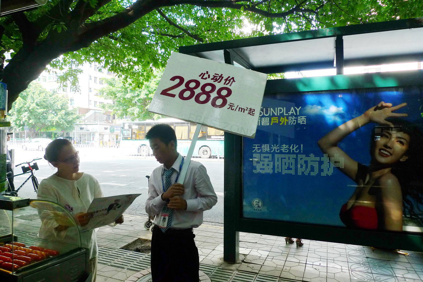 2012年05月22日,广东省深圳市下梅林街头,地产中介扛着写有“心动价2888/平方”的广告牌,推销惠州的小产权商品房。 雨歌/CFP