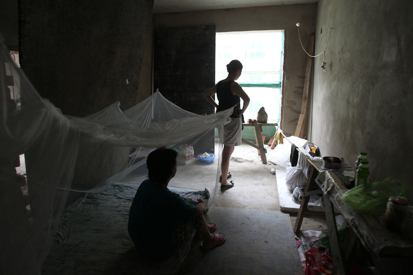 2011年7月28日,北京市,两位业主居住在尚未完工的楼房里看护自己的房子。位于房山周口店栓马庄的一个未完工楼盘遭强拆,据悉该楼盘属于“小产权房”。