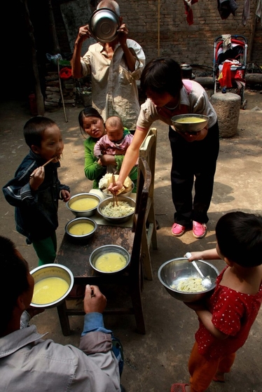 2012年9月17日,陕西省渭南市华阴市桃下镇马跑泉村,李明荣和他的六个孩子。稀饭、馒头加一碗土豆丝就是一家人的午餐。 梁萌/CFP