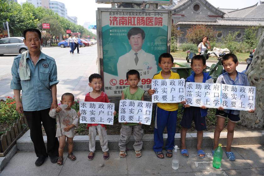 2010年7月6日,山东济南街头,来自山东省沾化县下洼镇的40岁农民孙胜清带着自己2岁到14岁的六个孩子在街头寻求帮助。 由于他和妻子长期在外地打工流浪,导致严重超生,孩子至今没有户口,无法上学。 罗波/东方IC
